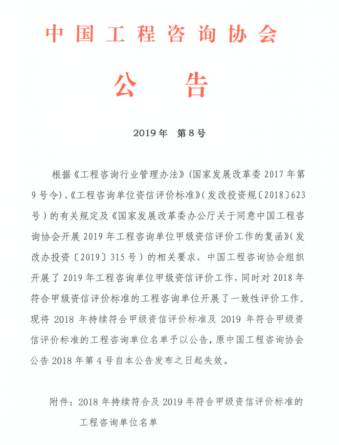 8號(hào)公告”,我院順利取得建筑、市政公用工程甲級(jí)咨詢評(píng)價(jià)證書。